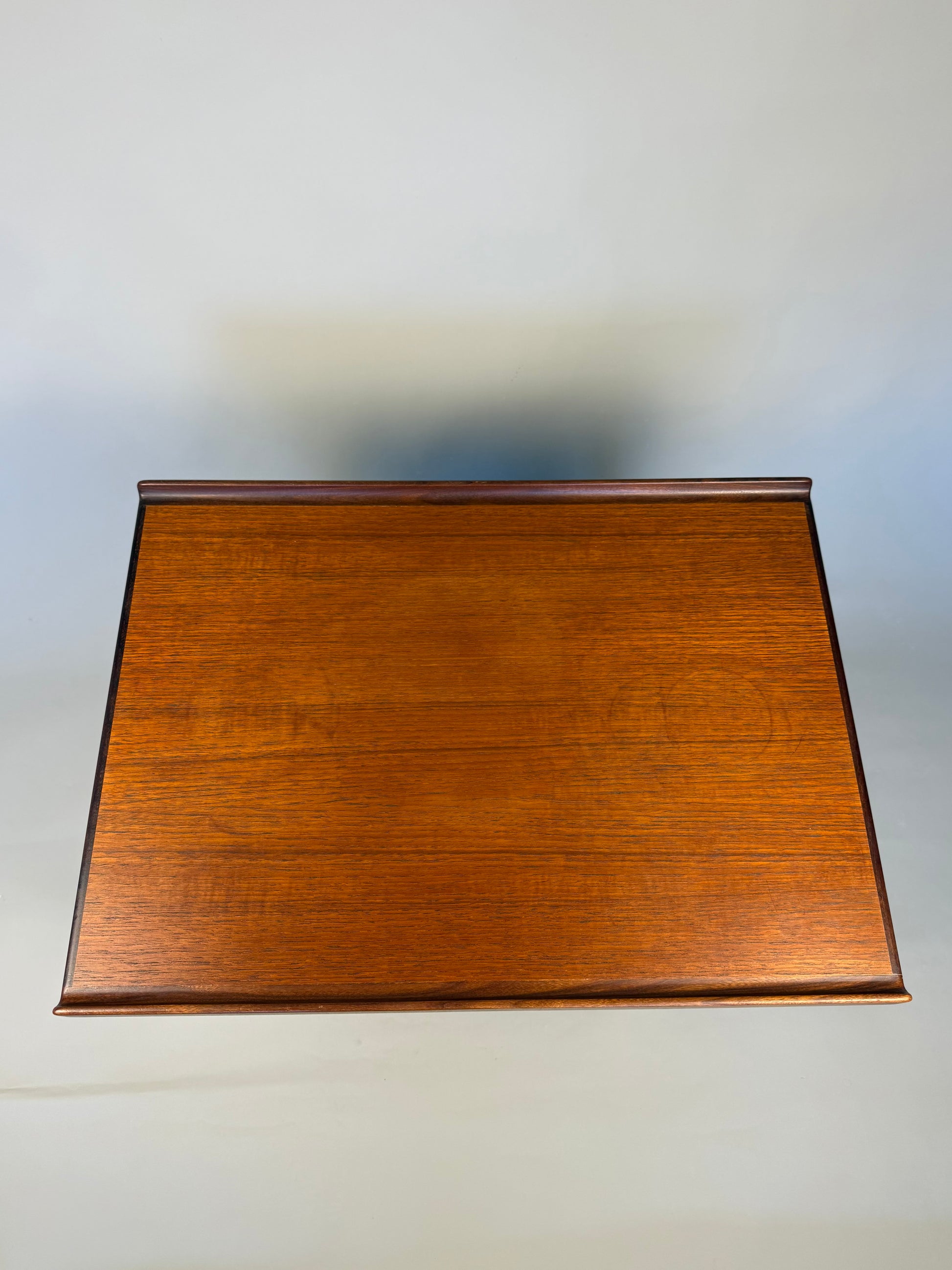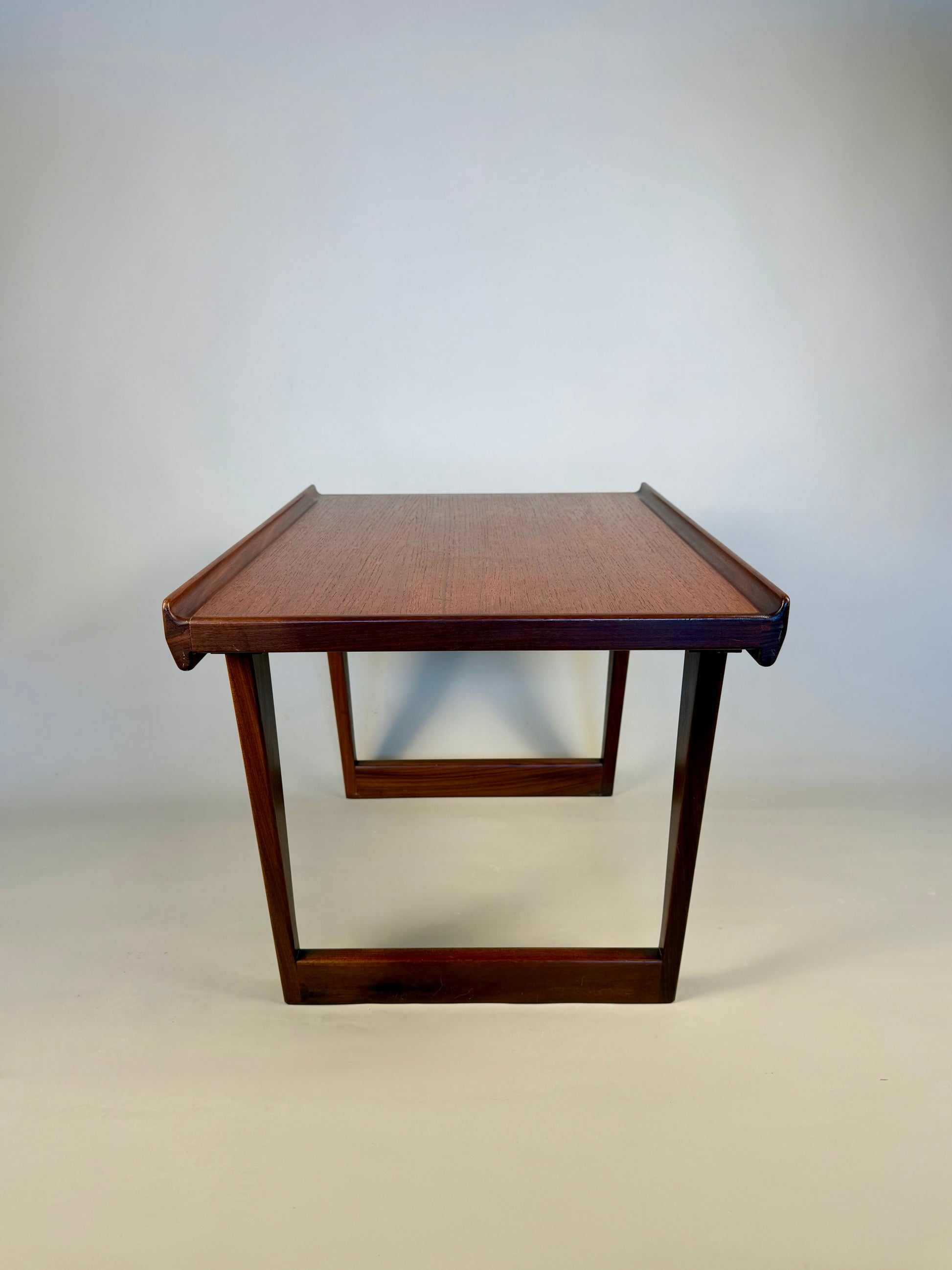 This Scandinavian low table was produced in Denmark in 1967 by Lovig Dansk Design, as indicated by the original stamp under the base. It features a teak structure with characteristic architectural legs and a raised rear edge on the top.