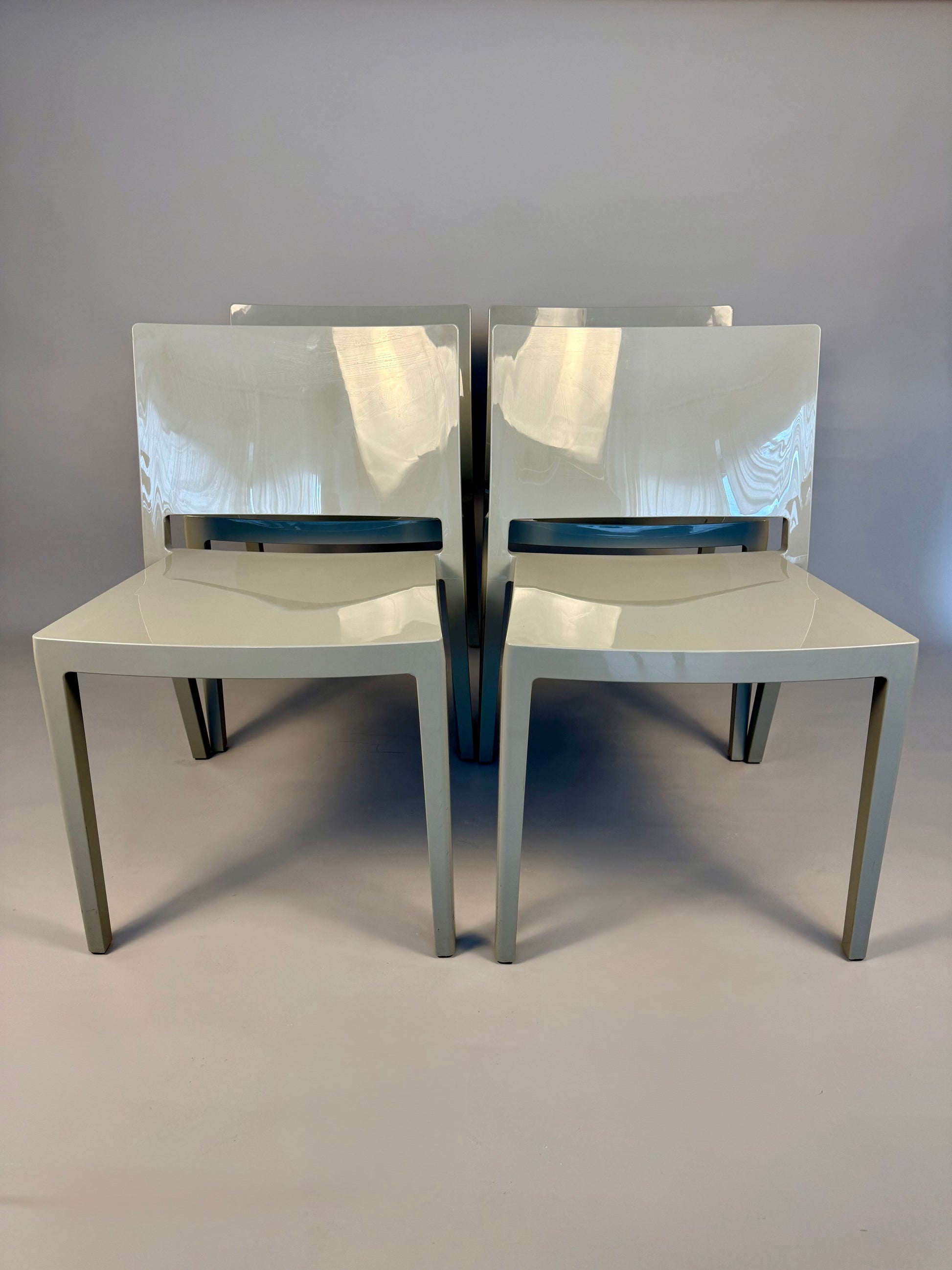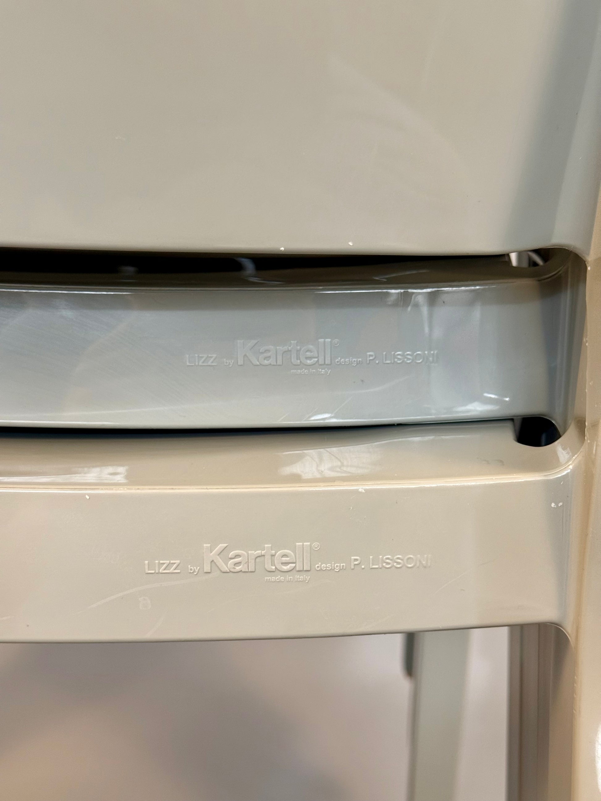 This set of four Lizz chairs was designed by Piero Lissoni for Kartell and made in Italy. The model is stamped “Lizz by Kartell – design P. Lissoni” under the seat.