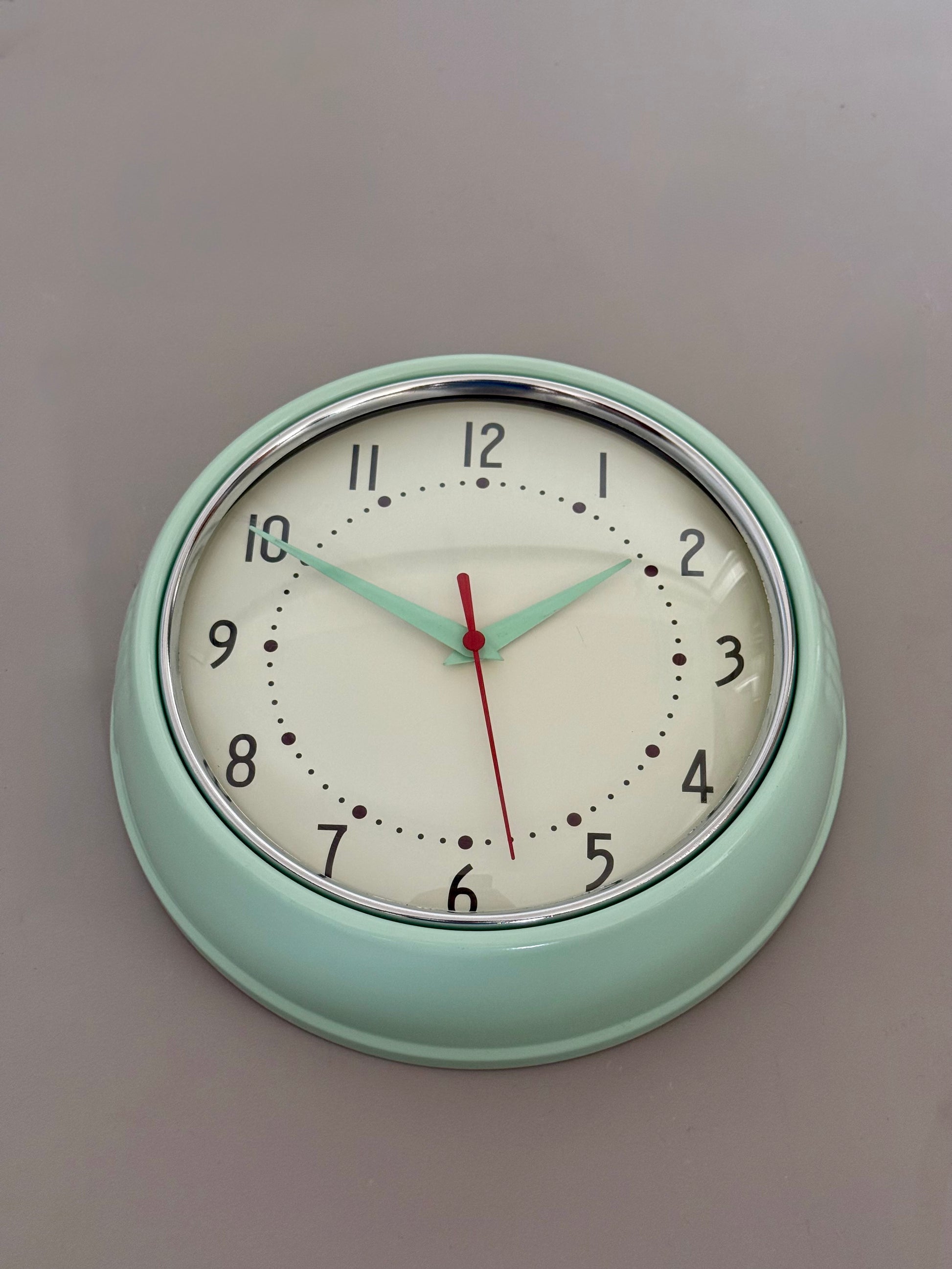 Vintage wall clock with mint green metal case, chrome-tone bezel and contrasting red second hand.
