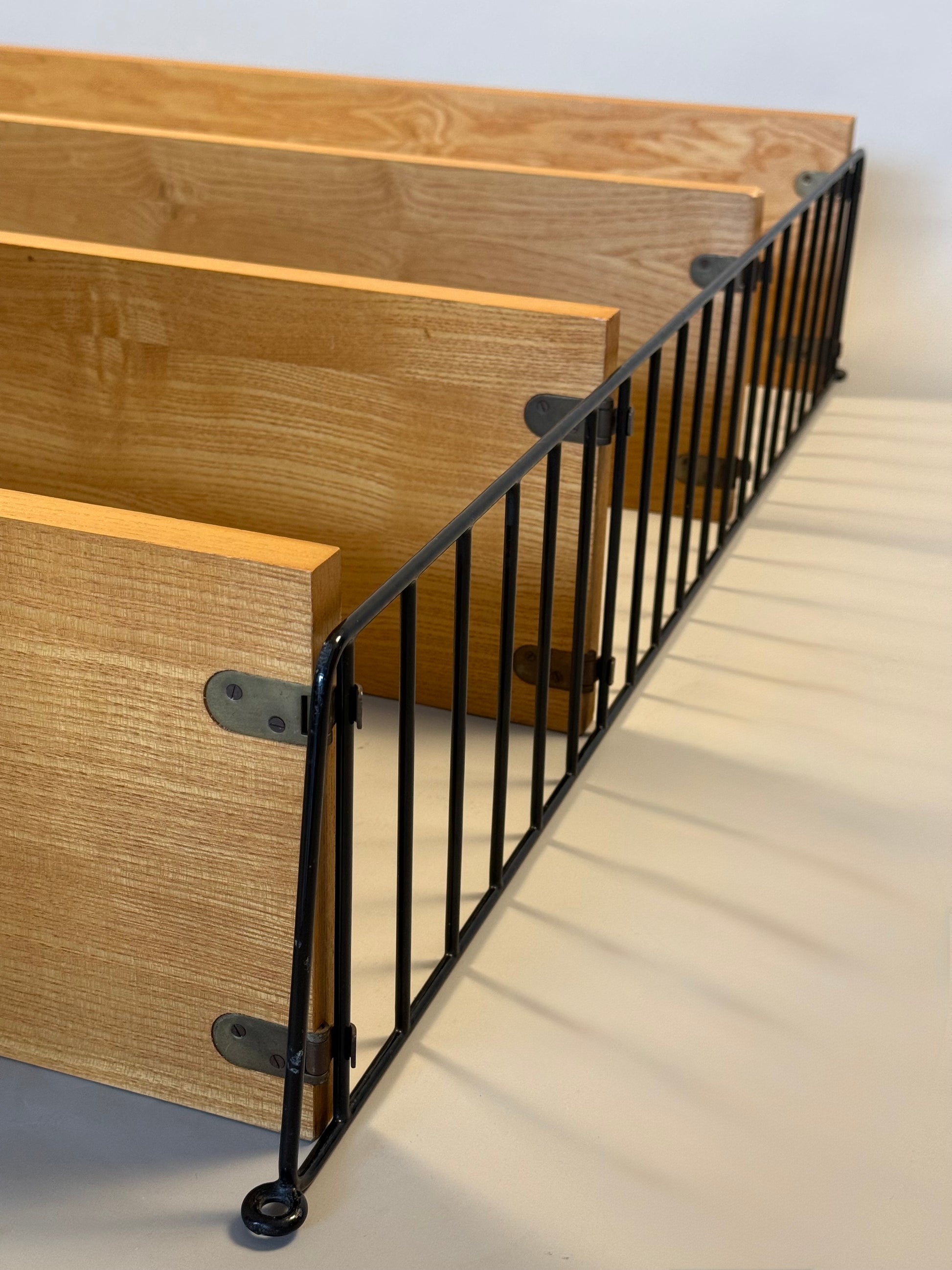 This wall-mounted shelving unit from the 1960s features three wooden shelves combined with black metal side supports. The design is minimal and functional, typical of mid-century Scandinavian production.