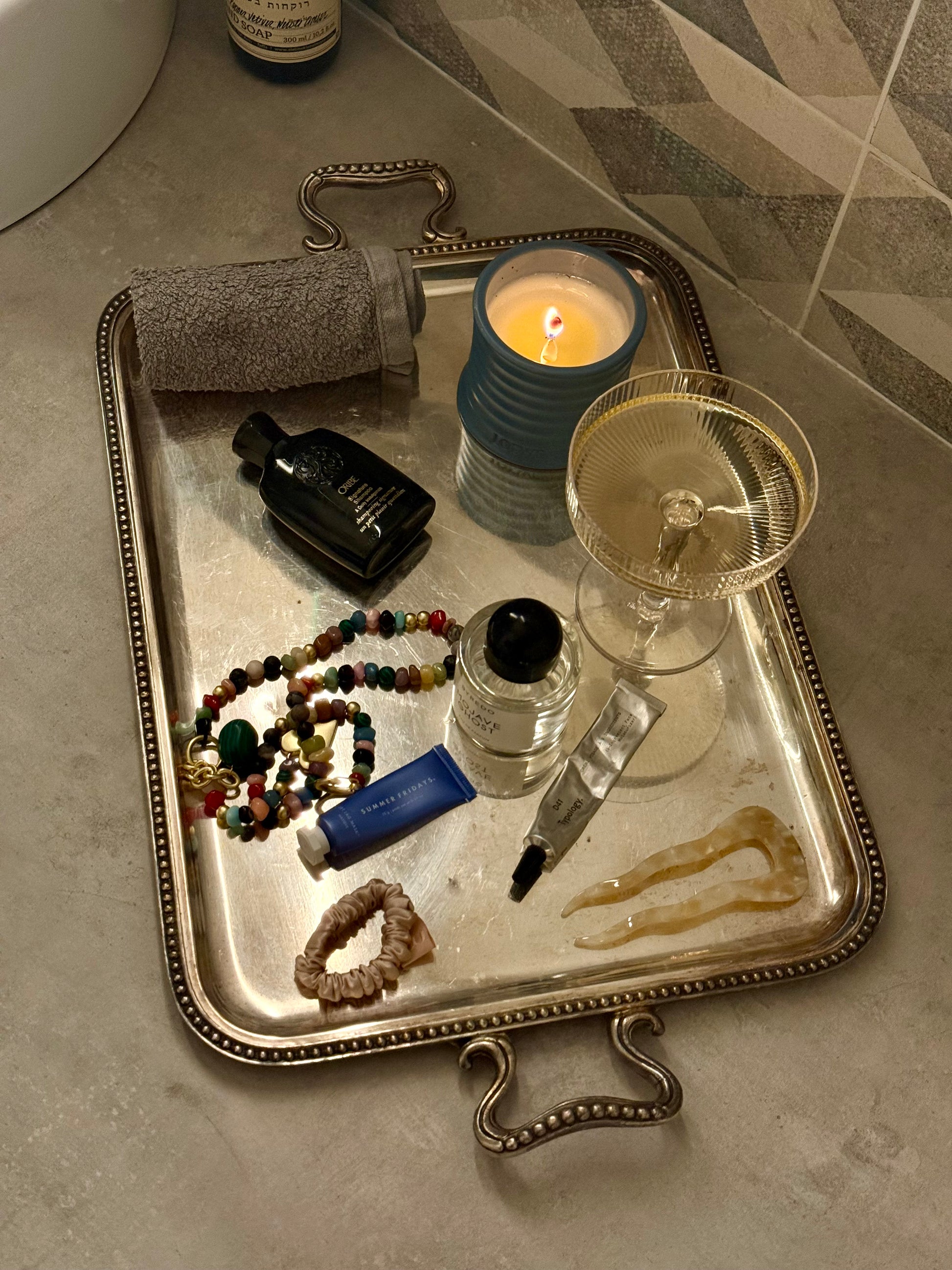 This vintage silver-plated tray features an elegant rectangular form with decorative side handles and a finely beaded border. A functional and decorative piece offering generous surface space.