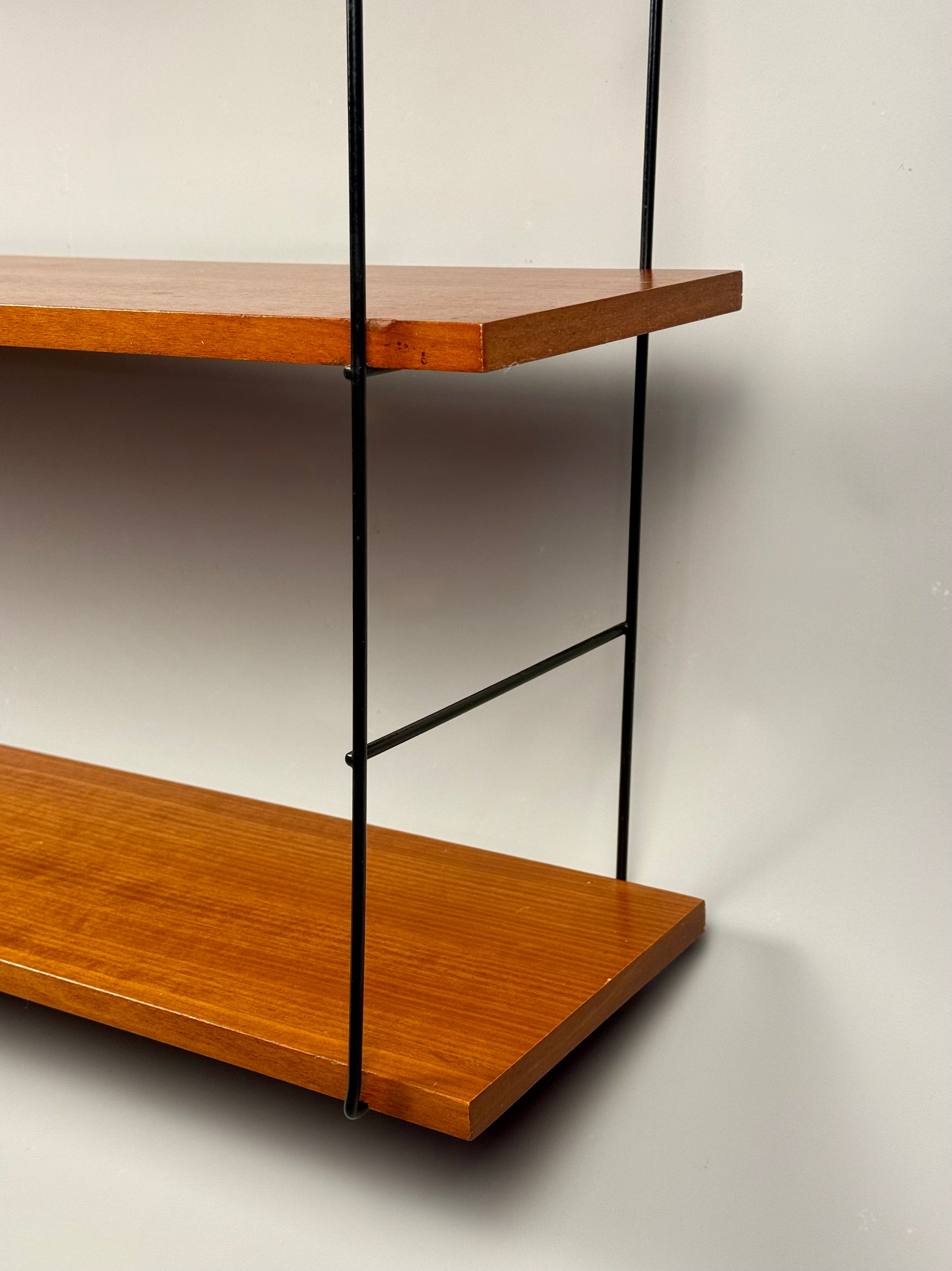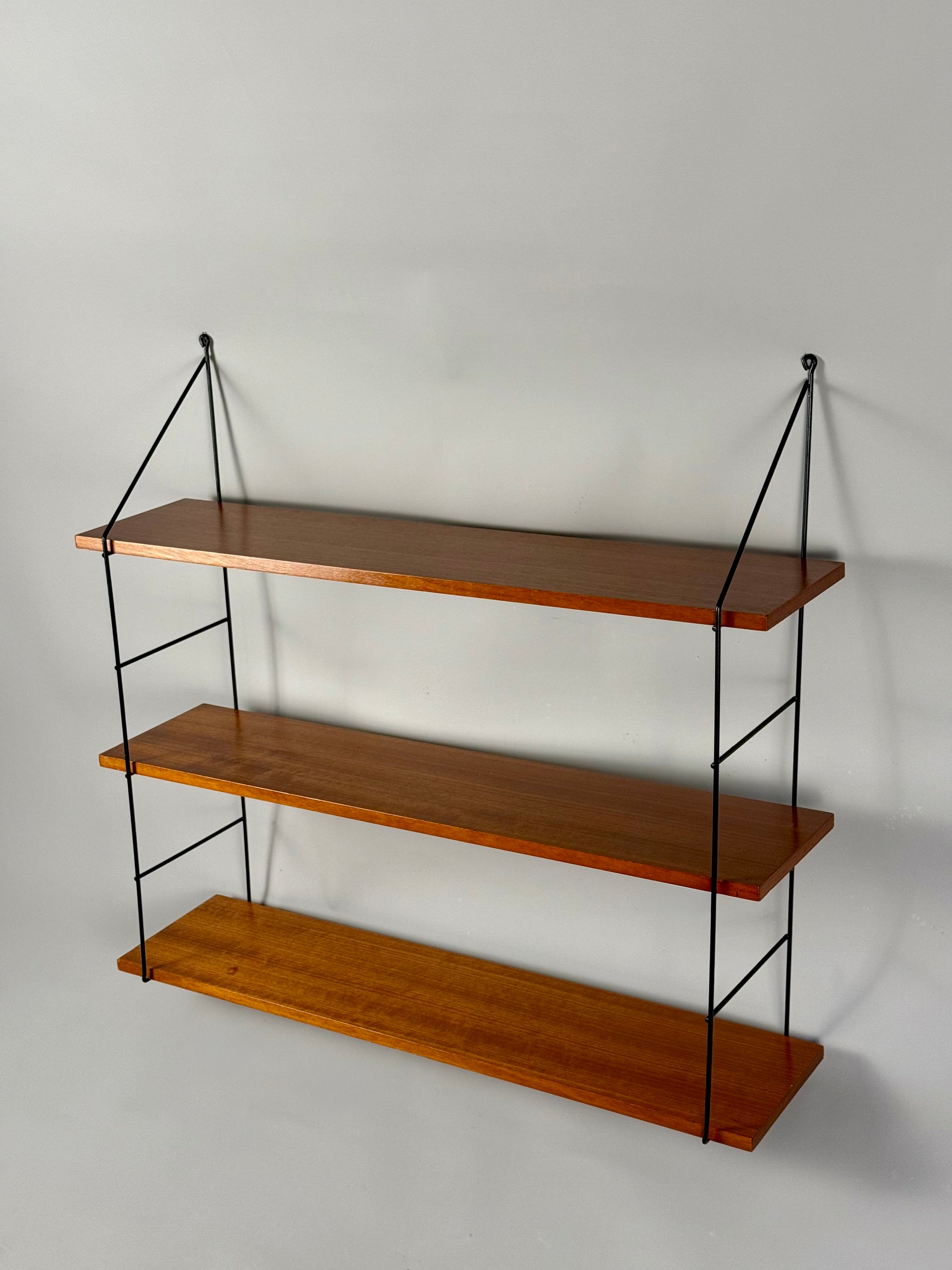 This vintage wall-mounted shelf features three teak veneer shelves supported by a black metal structure. A functional and decorative piece, perfect for adding warm tones and practical storage to your interior. The shelves show light signs of age, consistent with vintage use.
